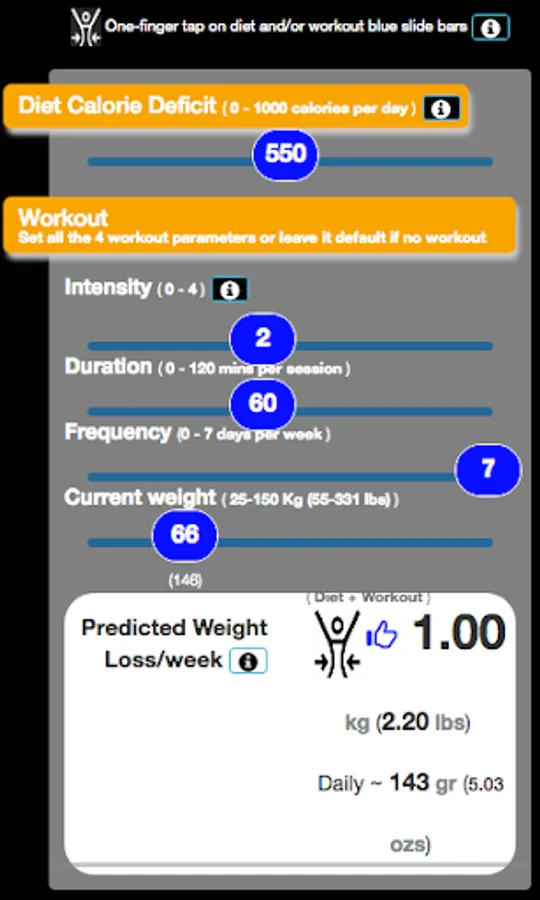 Have you ever wonder how much weight you can expect to lose (in kg,lbs,gr,ozs) weekly(or daily) depending on your current habits? or how much change you need to make to reach your weight goal. Science has shown that weight loss through step-by-step goal-implementation is more effective at long-run. If so, this is the right app for you. "Belly Calculator" app will help you to find out the right food/workout plan that better meet your goals in a very easy and fast way. It follows WHO recommendations for a healthy weight loss rate and maintenance.