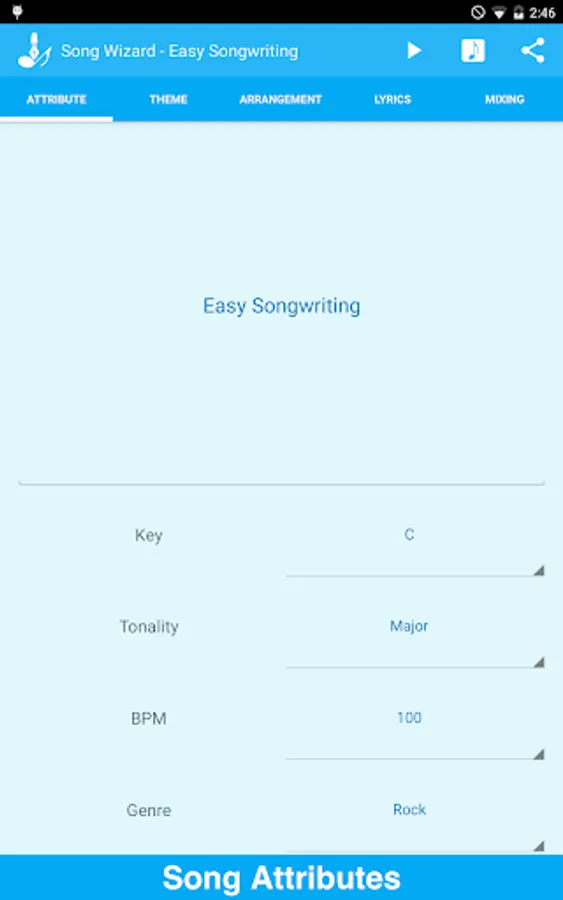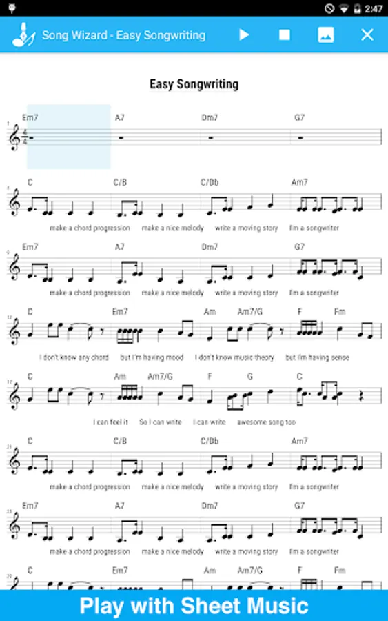 "Songwriting Wizard" is a tool to help you easily create your own songs. The algorithm of "Songwriting Wizard" can be infinitely create unique songs. With a little musical knowledge, you can create an awesome song.