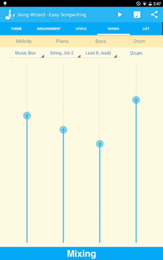 Write your lyrics for the melody. Select your instrument for each track and set the volume.