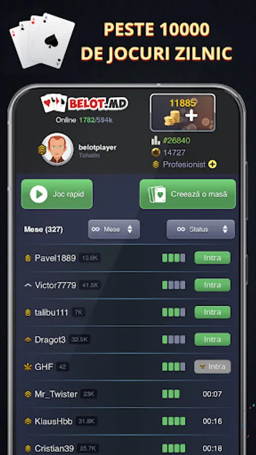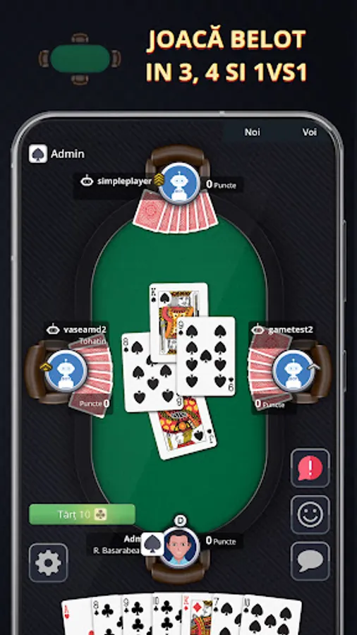 Download the application, create a new account and immediately you will be able to play belot at a table of 2, 3 or 4 people. In case you still don't know the rules of the game, you can find them right in the application in the Rules section. Win games, collect coins and you will be able to participate in championships where you will compete with the best belotists from all over Moldova.