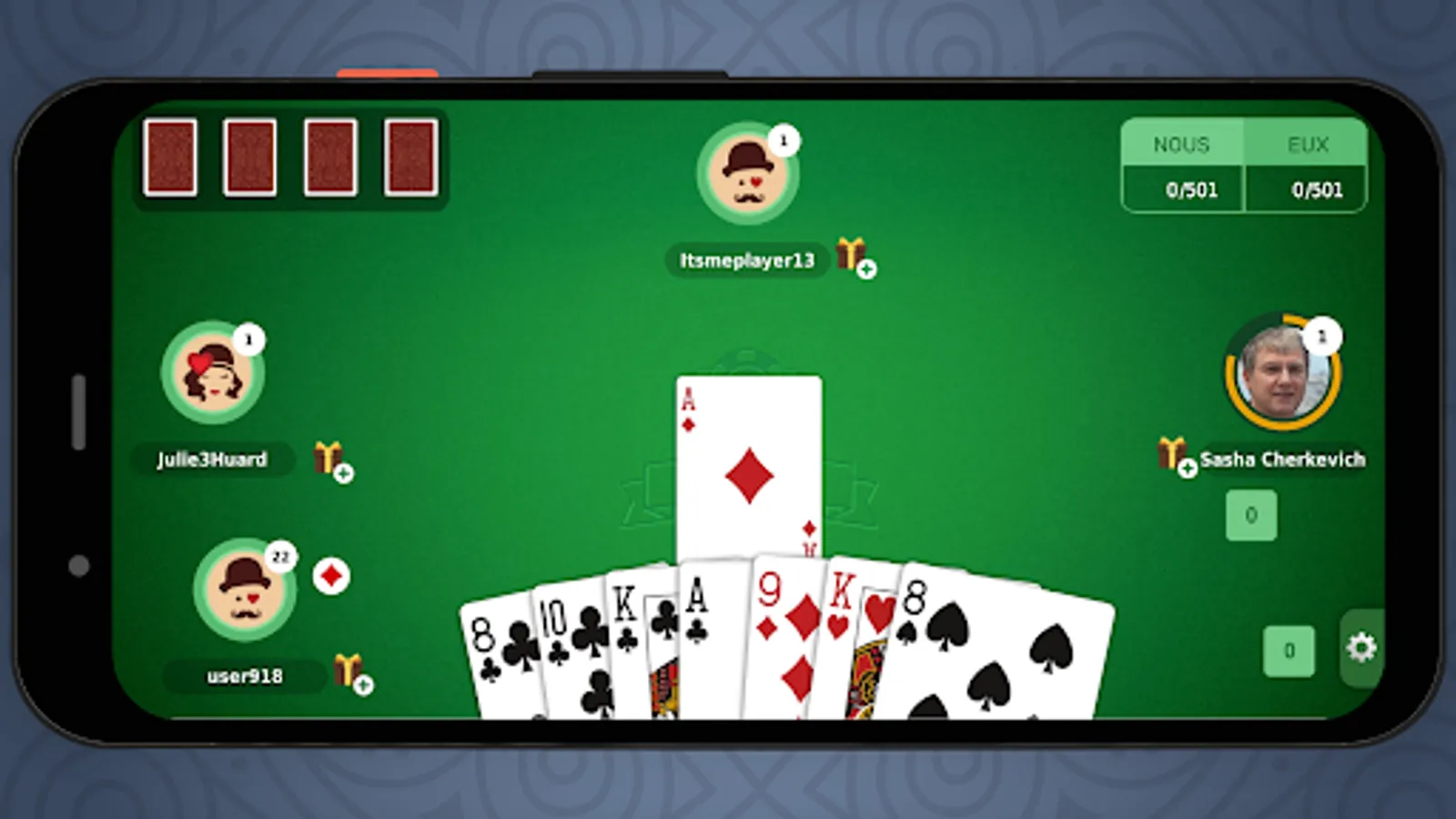 Doesn't matter if you are a beginner or a belote master, you will always find the opponent of your level in this game. The high-level artificial intelligence will always give you a suitable match.