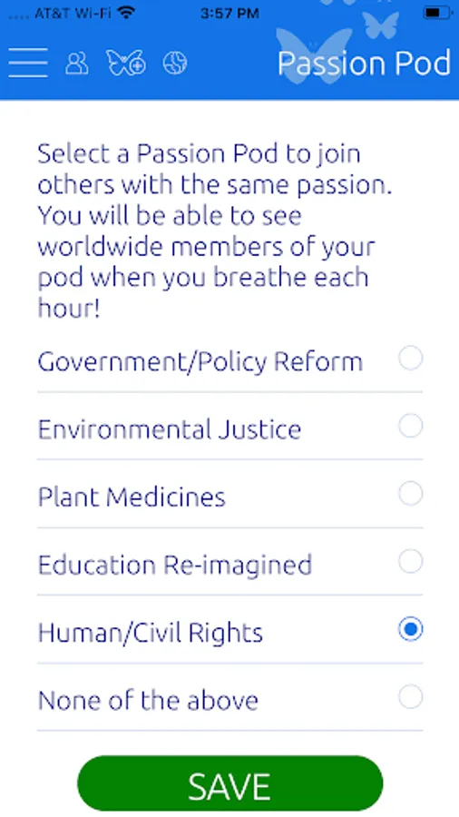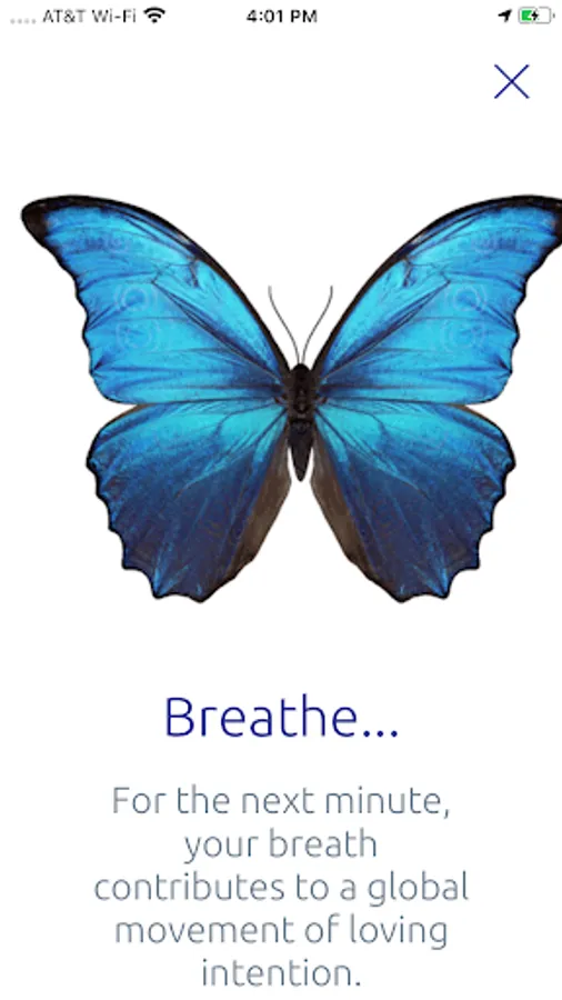 After tapping your notification you are encouraged to breathe with the Morpho Butterfly, which guides the pace of a meditative breath accompanied by the 528Hz tone. At the end of the one minute, BELovers are taken to the My View screen where they receive real-time statistics about how many people are breathing, and where they are geo-located across the globe, in your Soul Pod and in your selected Passion Pod.