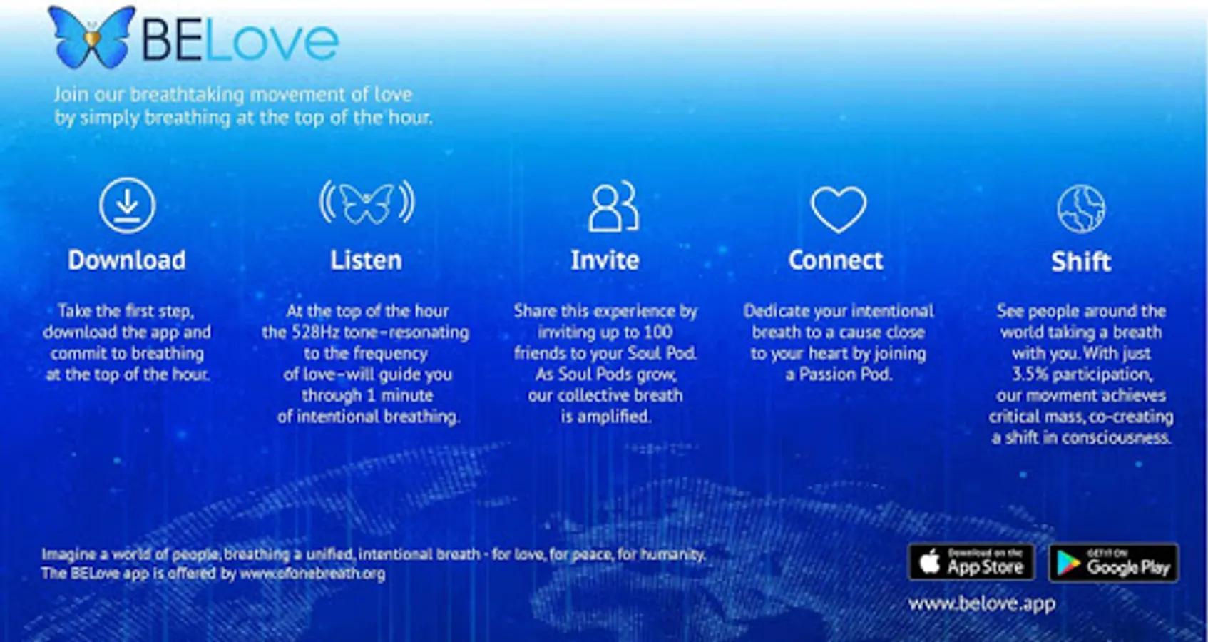 The BELove app is designed for a connected community experience through the simple act of breath. The app brings people across the globe together in a one-minute meditation of loving intention by simply breathing at the top of every hour.