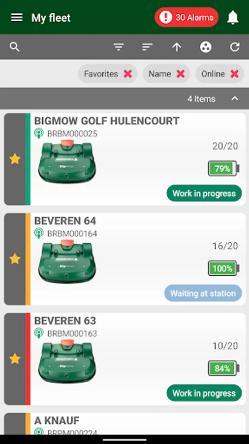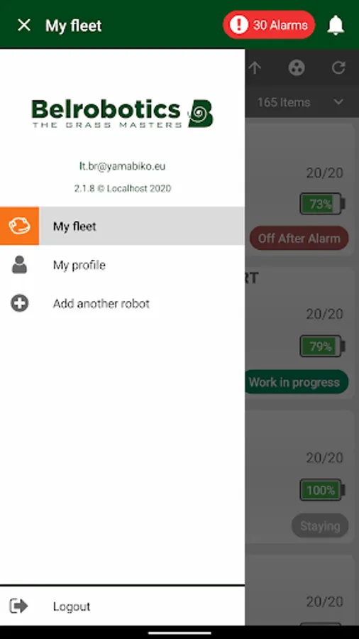 The Belrobotics app gives you control to your robot, wherever you are. Check live status, battery level and performance of the last five days. Get easy overview of activities, parameters and schedule. Send any commands and get instant confirmation. Check robot GPS Location with associated alarms position. Search, sort, filter and group to compare robots.