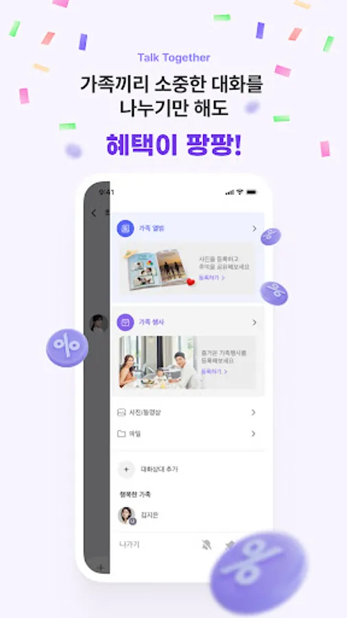 가족대화방: 가족들을 초대하여 대화방을 만들고 호텔 예약, 선물하기, 사진인화등 다양한 헤택도 누리세요.