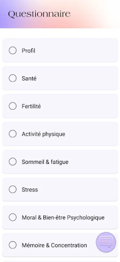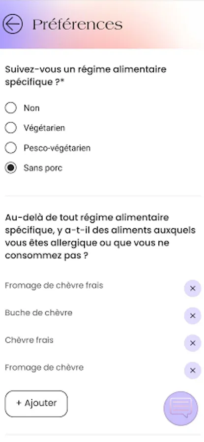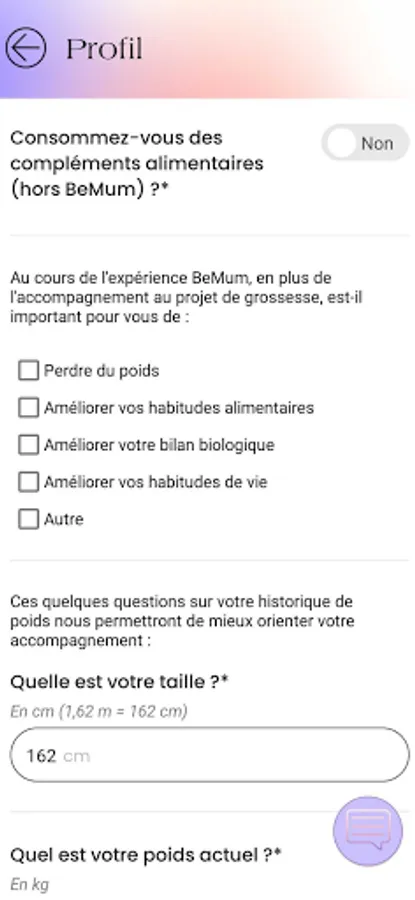 Regularly update your data in our detailed questionnaires, so that we can optimize your recommendations. A first series of questions on your personal characteristics and your lifestyle allows us to determine your daily nutritional needs, in order to provide you with all the nutrients you need to become a mother. A second questionnaire concerning your eating habits allows you to configure your food program as closely as possible to your tastes and desires.
