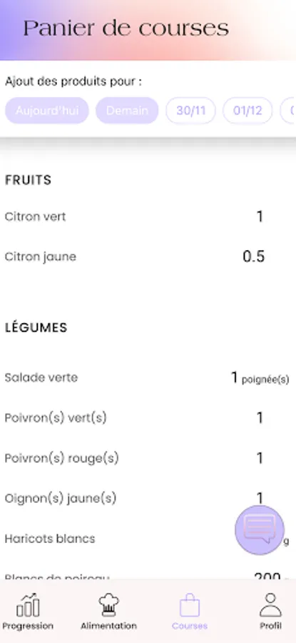 Select your recipes and we automatically generate the shopping list for your food plan ingredients. The shopping list simplifies your daily life by transforming your dishes into items to buy.