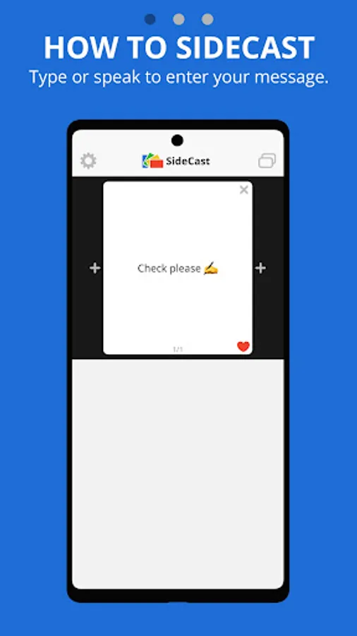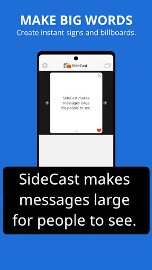 With SideCast™, easily enlarge typed messages on your Android phone or tablet screen, making it easy for others to see and read them from a distance. Write your message with text or emojis, then rotate your device to SideCast it to anyone nearby. This is the must-have messaging app for anyone who needs to communicate with someone silently, privately, or from a distance. The clearest messages are seen, not screamed. Save your voice, download SideCast today for free and start communicating more effectively.