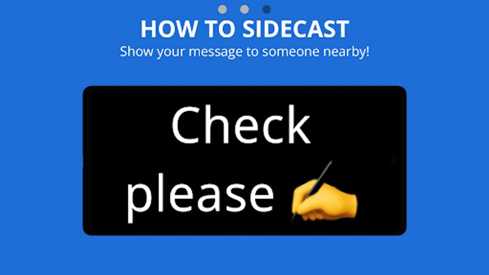 The options are limitless. Whether you're trying to get someone's attention, share a funny comment, or just want to say hi, SideCast makes it easy. Simply type or speak a message, then rotate your device onto its side to communicate with anyone nearby. Try it now, FREE!
