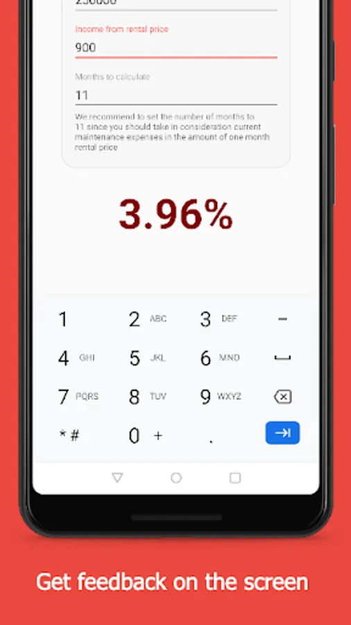 The final results will be the calculated yield in percentage. The color of the result will be red or green. green for yield of more than 4% in a year and red for a result lower than 4 percent.