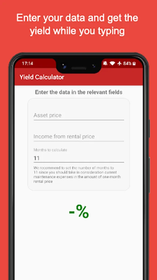 When you calculate the yield in the yield calculator, we recommend to set the number of months to 11 since you should take in consideration current maintenance expenses in the amount of one month rental price.