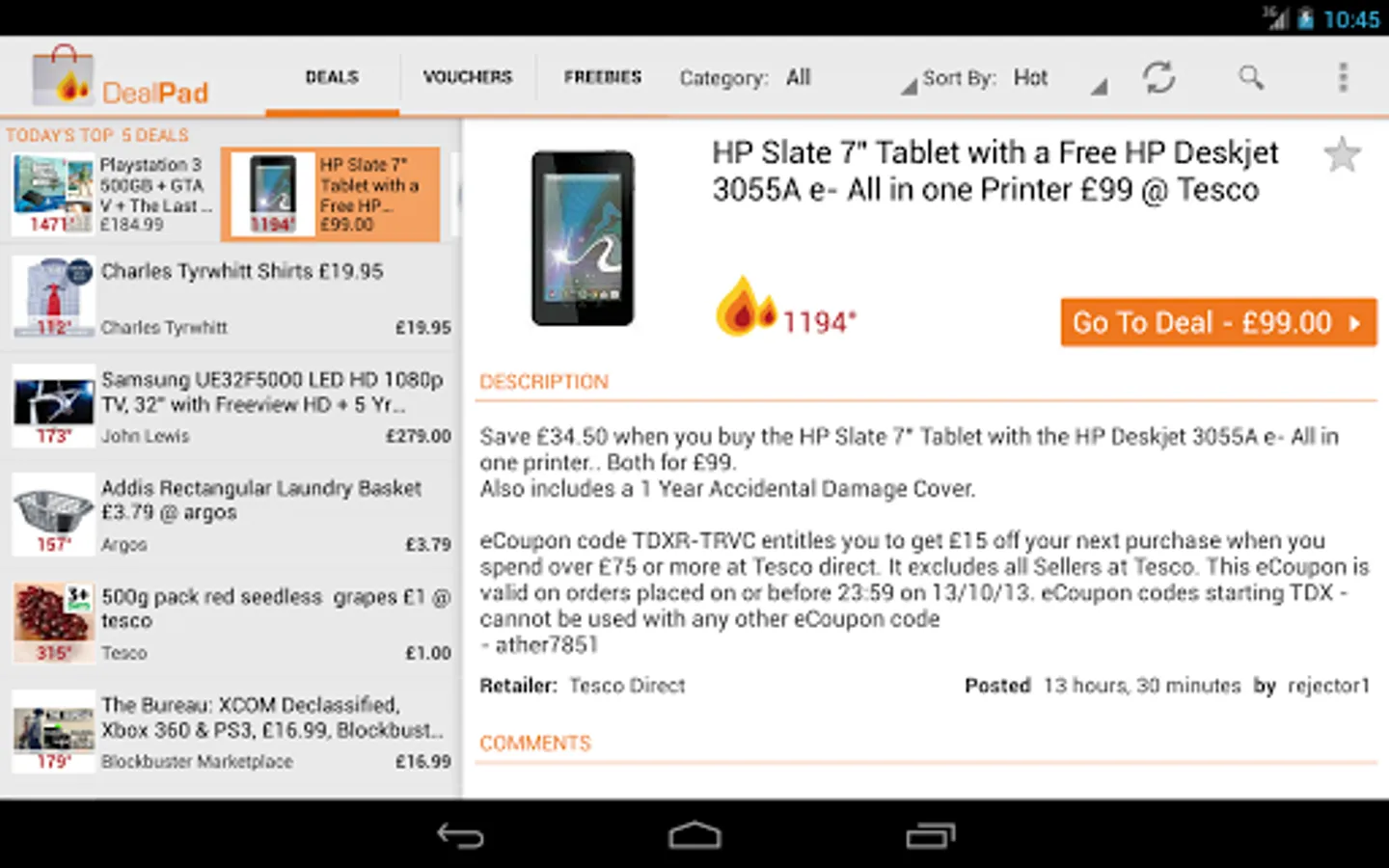 The application is specifically designed for Phones and Tablets giving your instant access to thousands of bargains shared by the HotUKDeals (hukd) community.