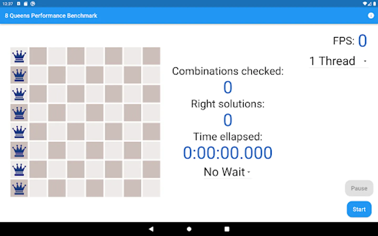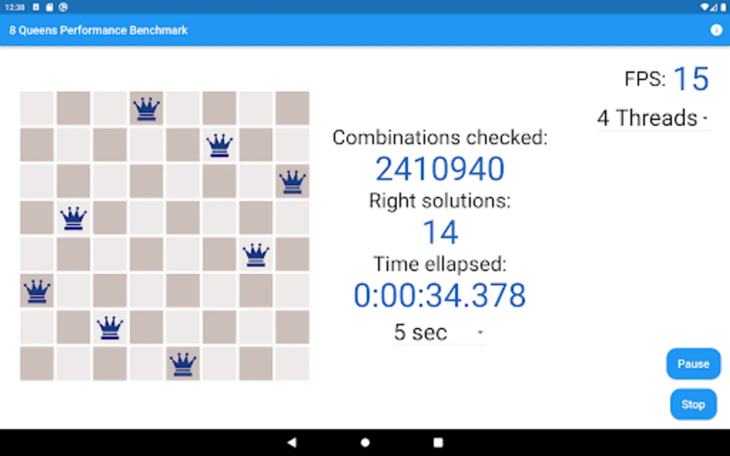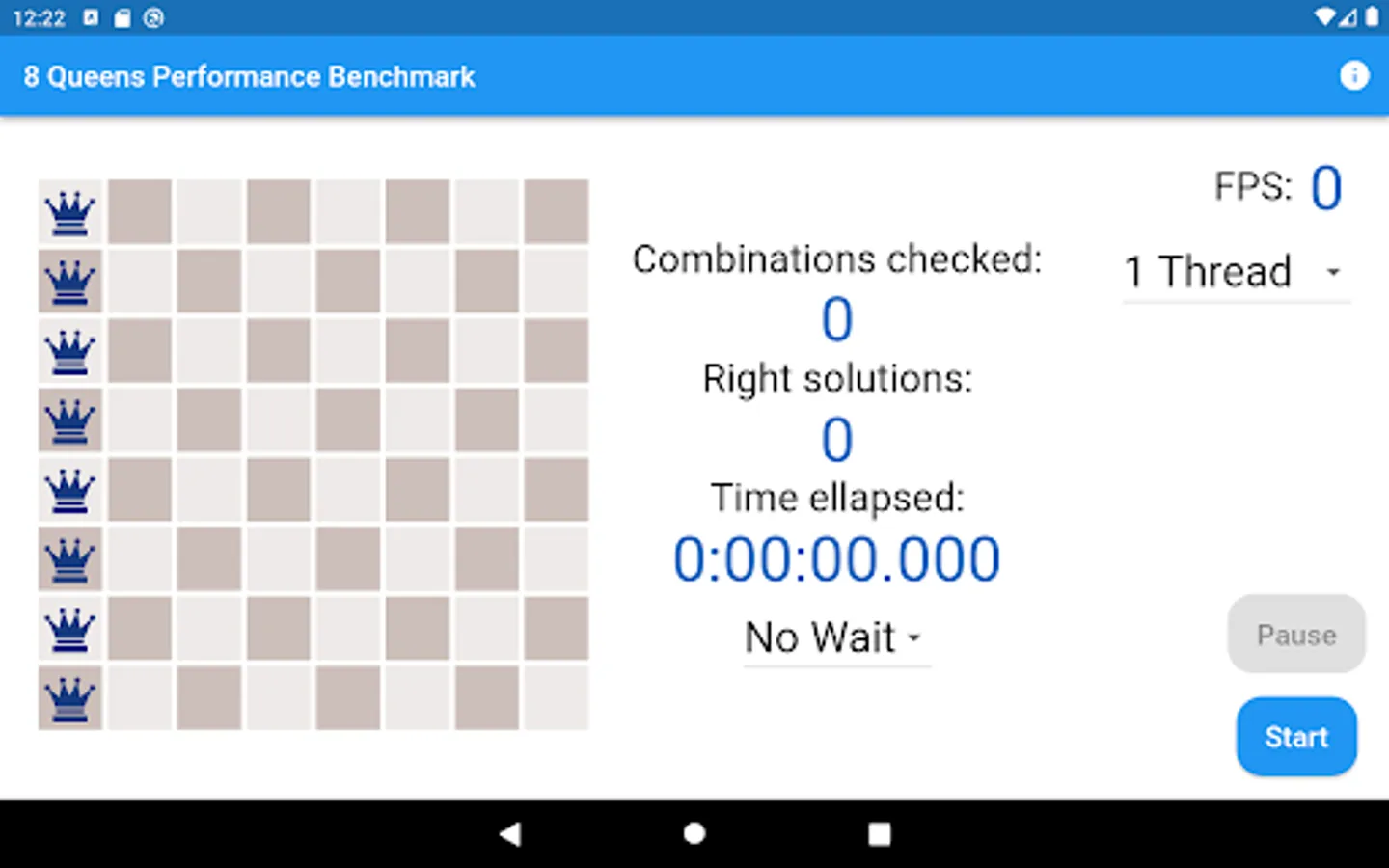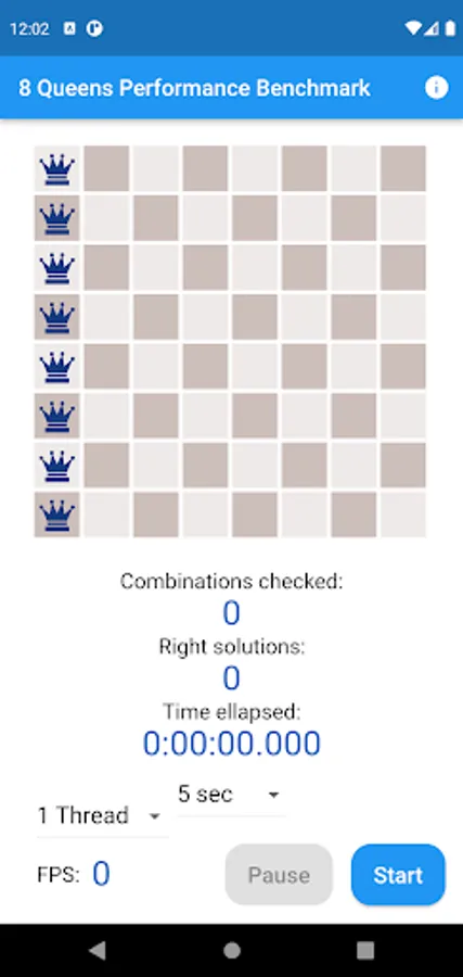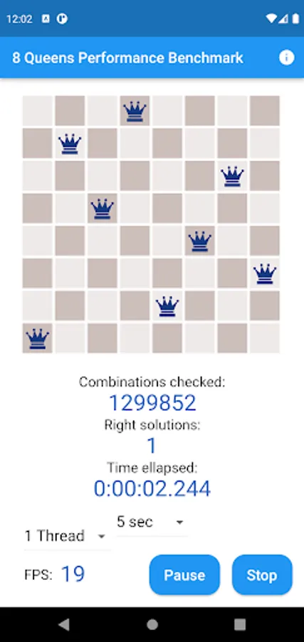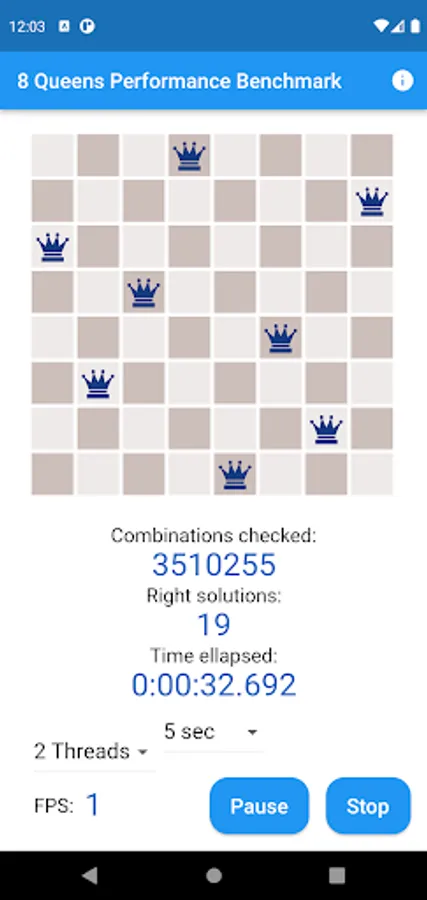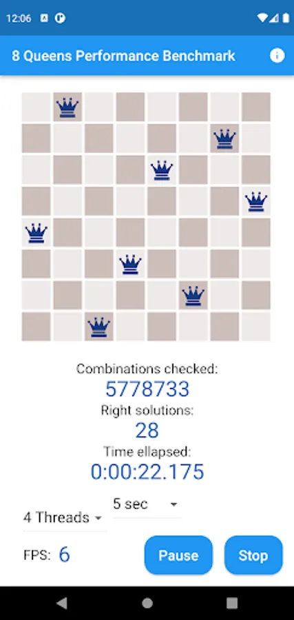 Eight Queens Performance Benchmark Test And Meter App is a Visual CPU Performance App. You can meter your smart mobile phone's speed with the Eight Queens Chess Problem solving. The App finds the 92 solutions from the 16 million variations where the eight queens don't attack each other on the 8x8 chess board. Finding the 92 right solutions with an up-to-date decent smart mobile phone lasts less than a half minute.