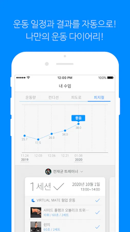 PT&Home training with trainer, AI-based virtual training class history and body changes according to class can be checked.