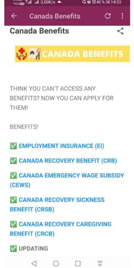 Canada Benefits Info App provides you with the latest news on upcoming payments and the Government's eligibility requirements for the Benefits and the money. This app is also a guide that provides a brief introduction on how to receive the benefit and how to apply through Canada Website.