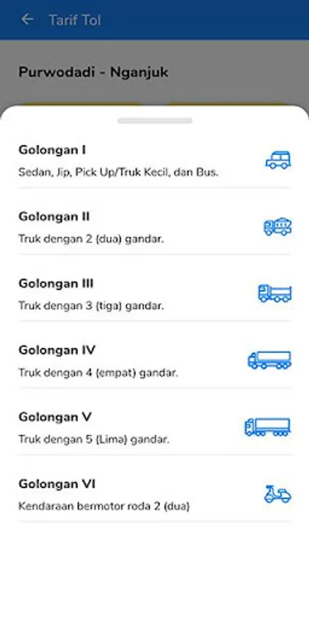 Toll Rates application can be used for all classes of vehicles. That is, starting from private vehicles, public transportation, to vehicles carrying goods can use the Toll Rate application.