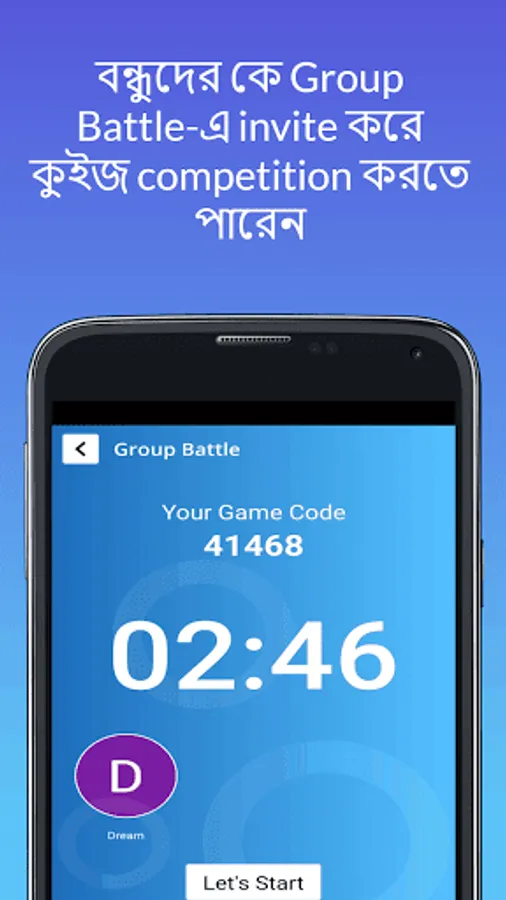 2. Group Battle : You can compete quiz with your friends or online player or with a Robot. (এখানে আপনি আপনার friends এর সঙ্গে Create Room করে Game Code শেয়ার করে কুইজ competition করতে পারেন)