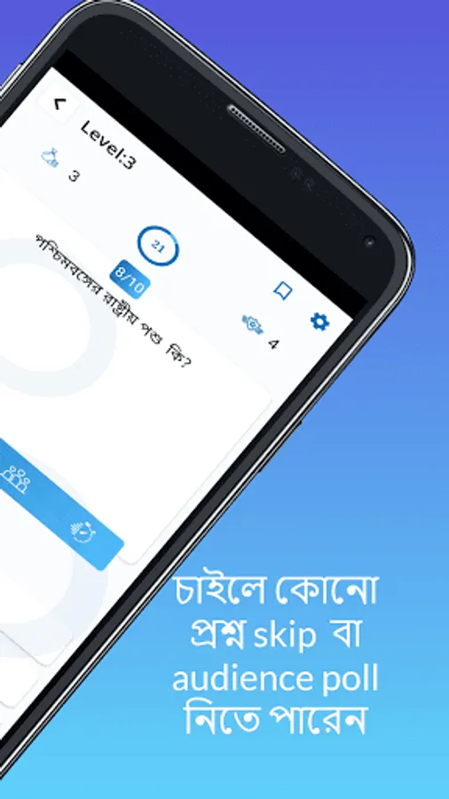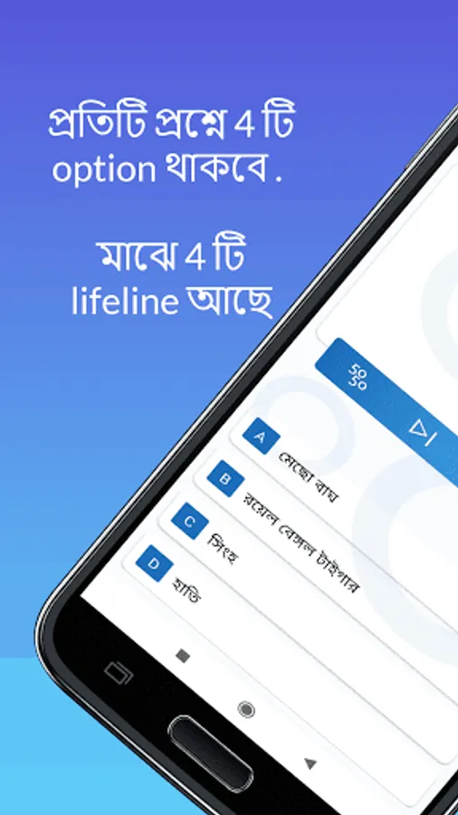 You can use four lifeline (50-50/ Skip/ Audience Poll / Time Reset) if you have any doubt on the answer. (আপনি কোনো প্রশ্নের উত্তর সঠিক না জানলে চারটি Lifeline আছে তার ব্যবহার করতে পারেন. এই Lifeline গুলি MCQ Option এর উপরে দেখতে পাবেন.):