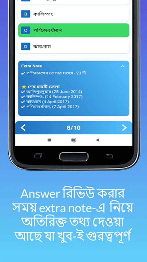 Extra Note: প্রতিটি কুইজ কমপ্লিট করে Review Answer অবশ্যই করবেন. এখানে কিছু গুরত্বপূর্ণ feature আছে. এখানে Extra Note একটা option আছে যেখানে আমরা উত্তরের details সমাধান দিয়ে থাকি. কোনো Science-এ অঙ্কের উপর Question থাকলে তার সমাধান করে দি. আবার কোনো দেশের রাজধানীর কোনো প্রশ্ন থাকলে, আমরা সমস্ত দেশের রাজধানীর নাম এই Extra Note ক্লিক করলে পেয়ে যাবেন.