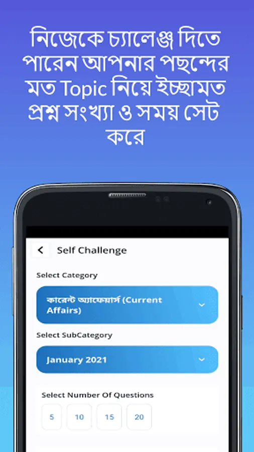 3. Self Challenge: You can find any quiz of your chosen topic with any number of question with time you choose. ( এখানে আপনি নিজের মুল্যায়ন করতে পারেন. নিজের পছন্দ কোনো টপিক choose করে নিজের পছন্দ মত প্রশ্ন সংখ্যা ও সময় সেট করে প্রাকটিস করতে পারেন. এখানের আগে থেকে উত্তরের Hint দেওয়া হইনা. Practice কমপ্লিট হলে আপনাকে submit অপসন ক্লিক করতে হবে)
