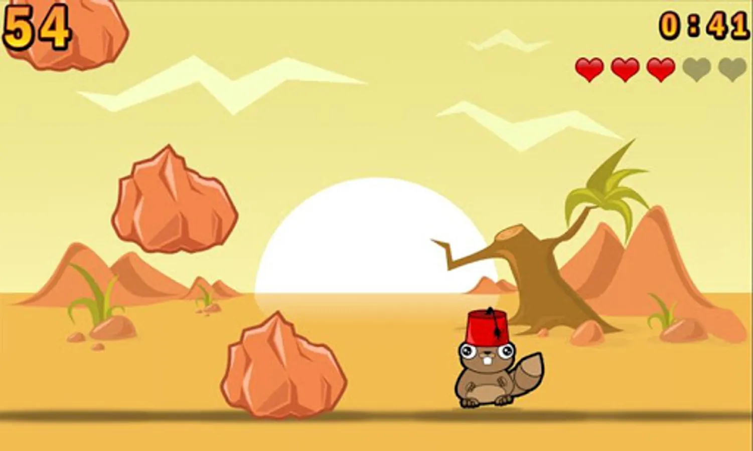 ● Survival mode - Unlimited time, but if you get hit three times, you die. Avoid the falling rocks and jump over the tumbleweed, try to survive and eat as many nuts as you can. Life in the hot desert is tough!
