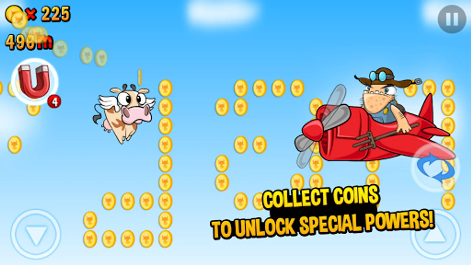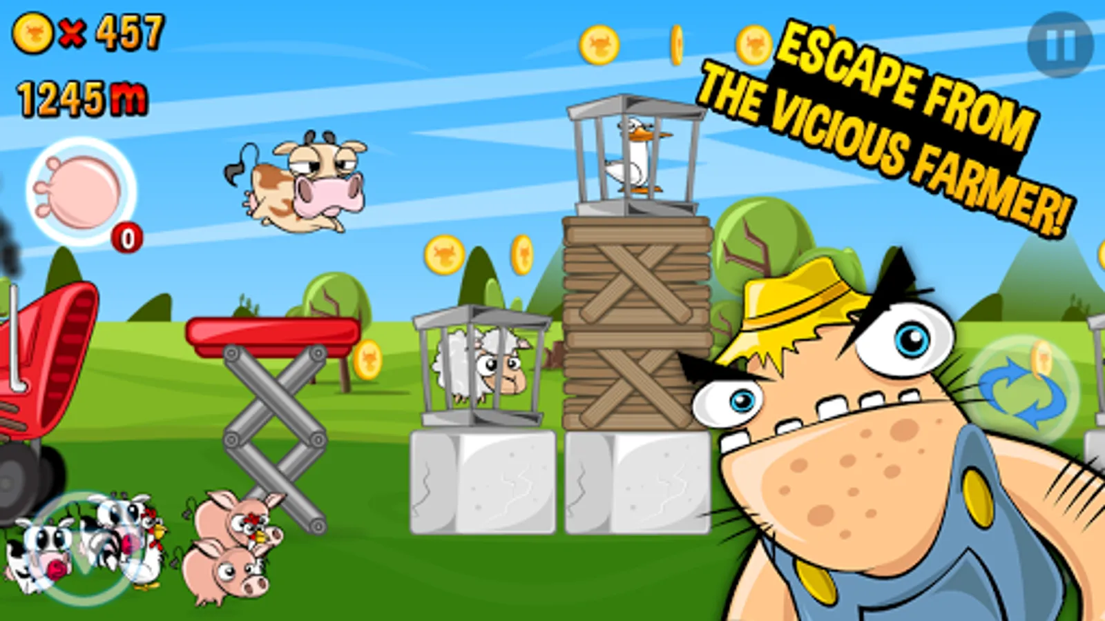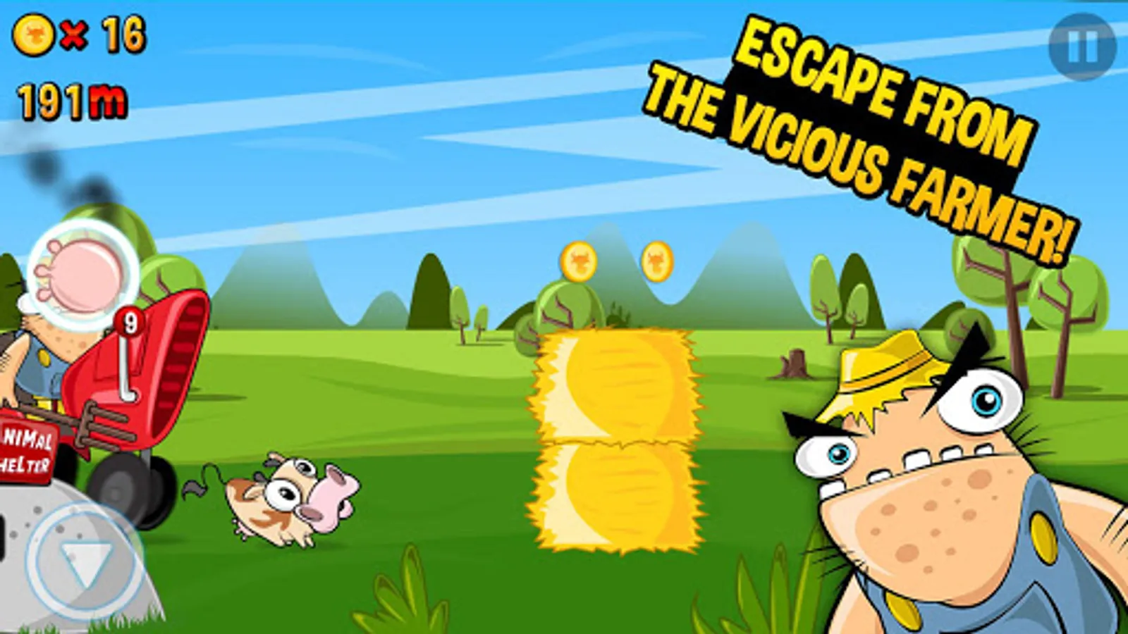 Jump over obstacles, slide under windmills, set the farm animals free and collect coins to purchase unique power-ups that will help the cow make it to freedom!