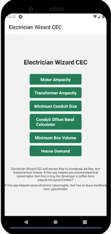 Ad Free, nuisance free forever! Electrician Wizard brings the hardest CEC Calculations to your phone screen, with an easy to use interface and plain English instructions.