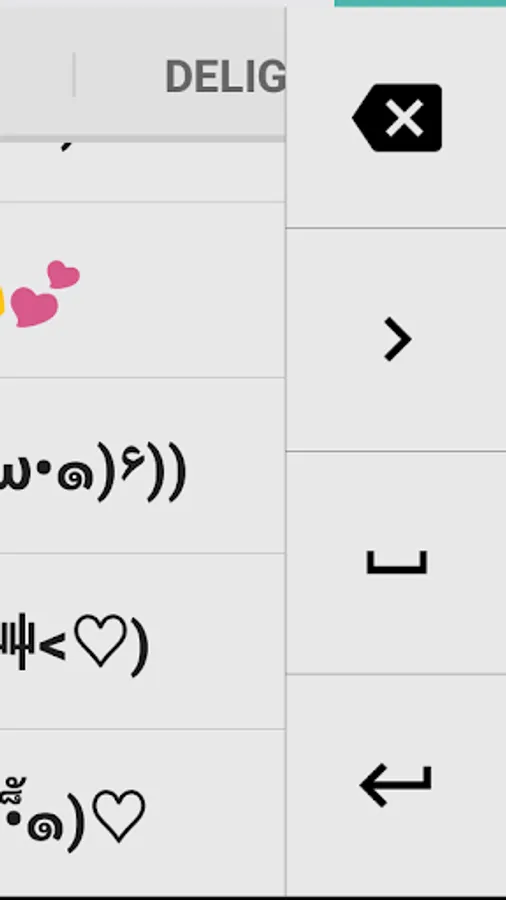 Press the face icon button on the upper left corner to open Emoticon Pack. Edit list of emoji and emoticon on your Emoticon Pack. It will be reflected your keyboard. Make your custom keyboard with your favorite emoji and emoticons.