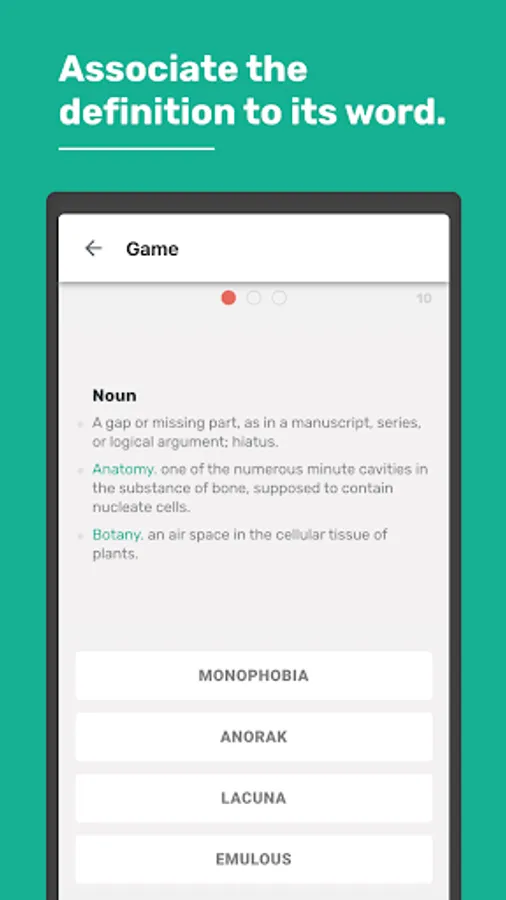 Voquludis helps you to enrich your vocabulary in a playful way by associating definitions to their corresponding words. Answer to as many questions as you can, you can make 3 mistakes and the game is over.