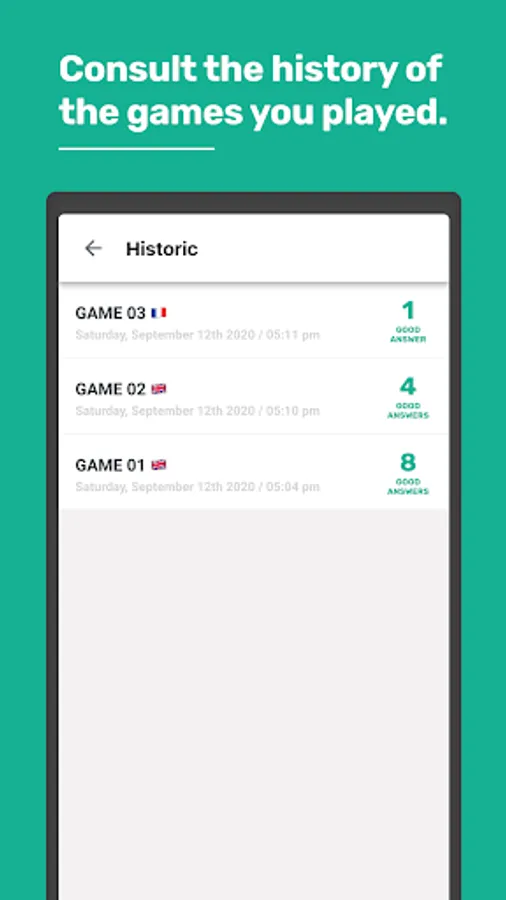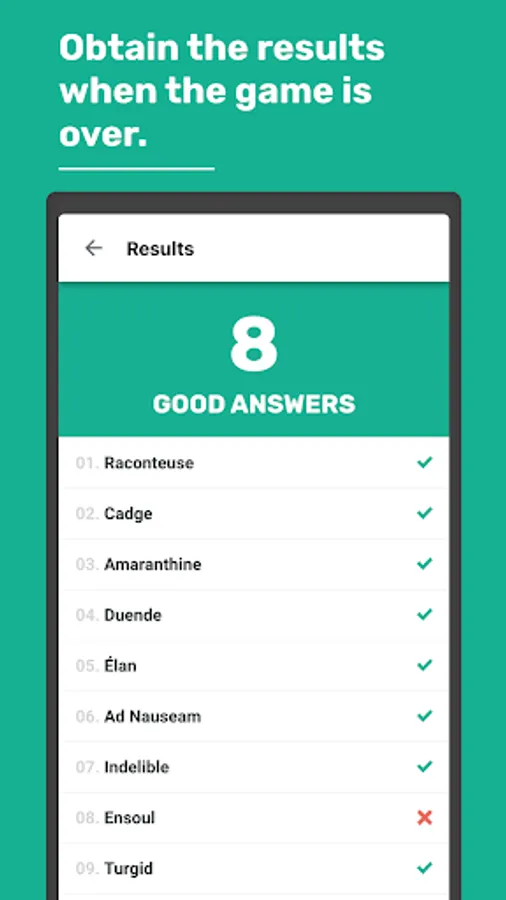 Once the game is over, you will be able to see the results, the glossary containing every word you have answered, as well as the history of all the games you have played.