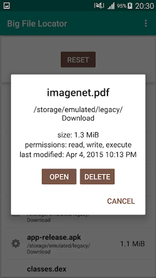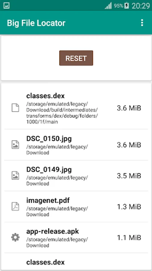 Big files can fill SD card and internal storage easily. Big File Locator help you to locate these large files in phone and delete them fast. Cleaning large media or image files can help you to organize your storage space. It's free, light-weight and with material design!