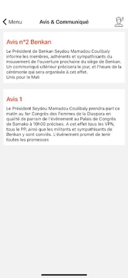 Benkan is a Malian Political Movement created on baptismal funds on March 06, 2021 and having obtained its receipt on April 06, 2021. The movement aims to establish itself in the 20 regions of Mali and the 10 communes of the District of Bamako according to the division administrative in the process of adoption. In just 6 months of existence, the movement has grown with an unparalleled enthusiasm. Given the large number of memberships, the management of members, supporters and members by innovative and modern means and tools is essential. This is why we have set up an application called Appli Benkan. Benkan meaning the citizens' pact.