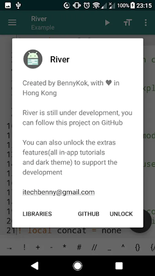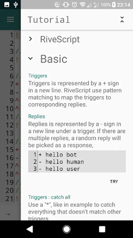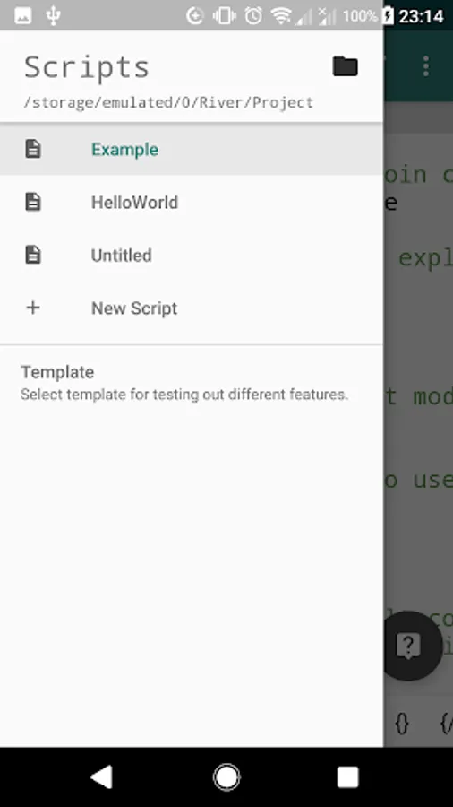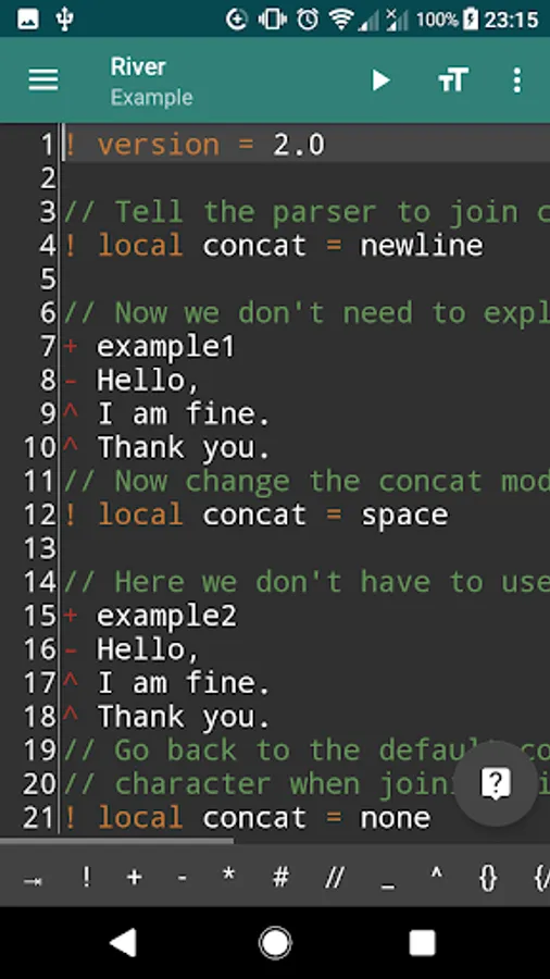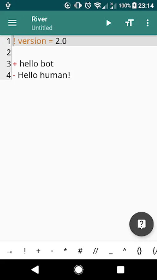 River is the first third-party IDE for the RiveScript on Android, providing a syntax highlighted editor, and bundled with the Java version of the RiveScript interpreter, and let you test out your script instantly. Also with interactive tutorials, and templates.