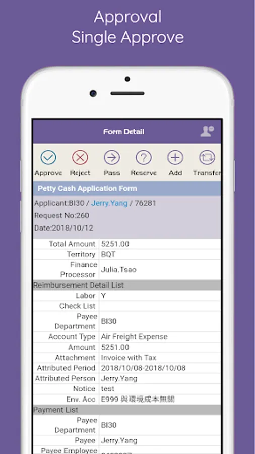 3. Approval functions (Approve/Reject/Pass/Reserve/Add/Transfer) and comment