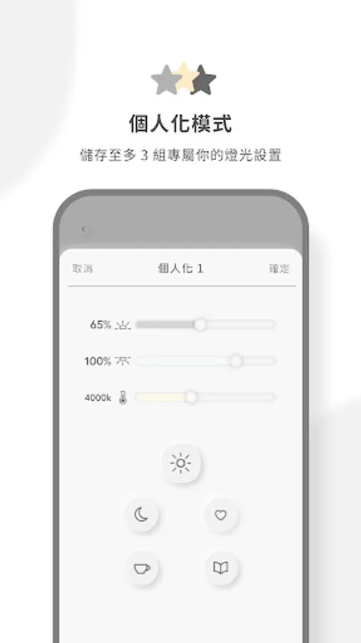 • Set up 3 customization modes to suit you, by choosing your own brightness and color temperature level