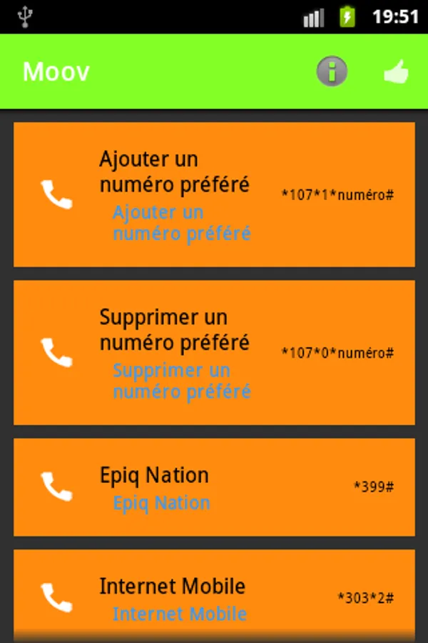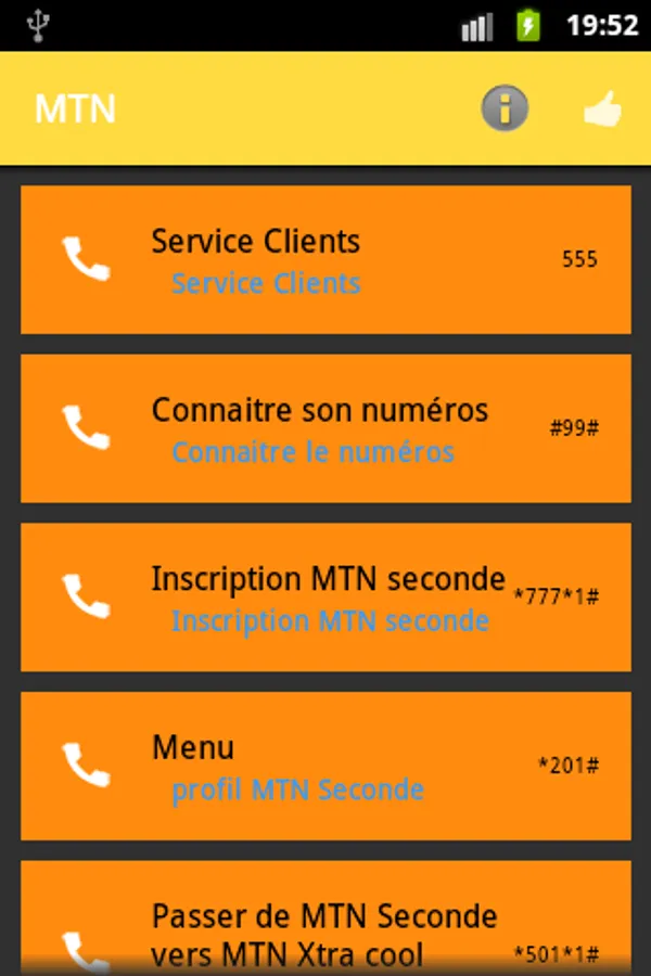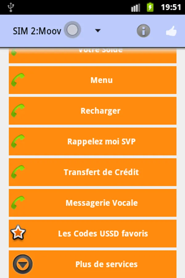 USSD SERVICES is an application that provides easy access to the most recurring services (USSD your balance, Call me, ...) in mobile operators in Ivory Coast. You are no longer required to learn by heart all the USSD code (* 120 # .....), you just have to launch the application and select the desired service.