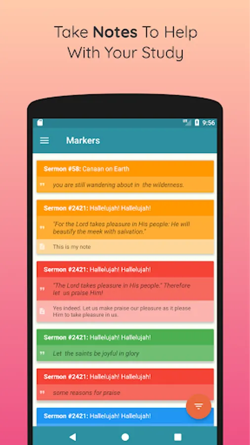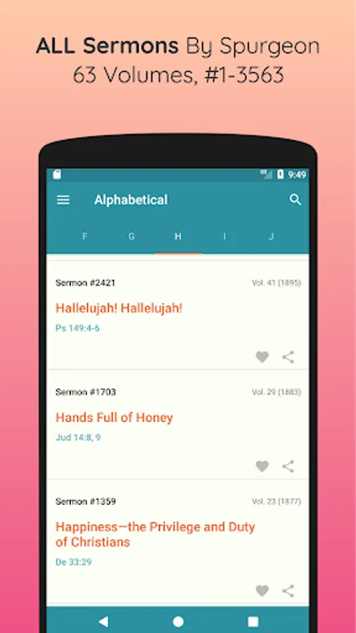 Spurgeon Sermons app contains ALL sermons (63 vols, sermons 1-3563) by the renown preacher, Charles H. Spurgeon, a.k.a. the "Prince of Preachers." Spurgeon's preachings are truly captivating, practical, and relevant even to this day. His sermons have inspired many, and become invaluable bible resources, for layman and preachers alike.