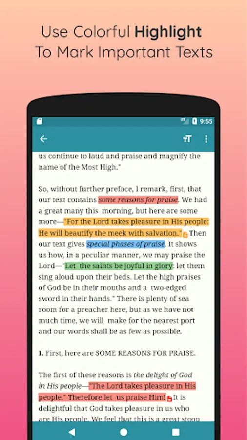 This app is beautifully designed to help you read and study all Spurgeon's sermons efficiently and with the best user experience. Also included in the app are: devotionals (Morning & Evening), books, sermon audio, and many other great works by and about Charles Spurgeon.