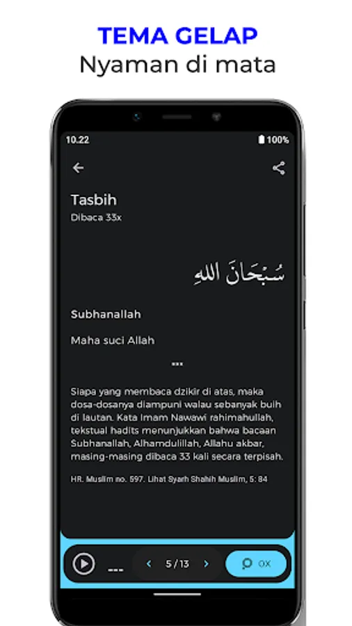 Dzikir pagi dan petang sesuai sunnah, dilengkapi dengan dzikir setelah sholat, bacaan latin dan audio mp3 offline.