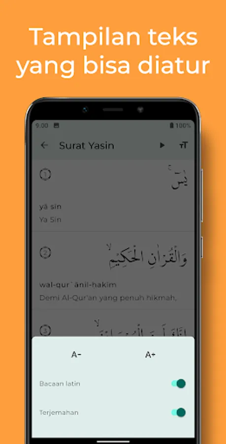Fitur Pengaturan Ukuran Font Arab, Menampilkan dan Menyembunyikan Latin atau Terjemahan.