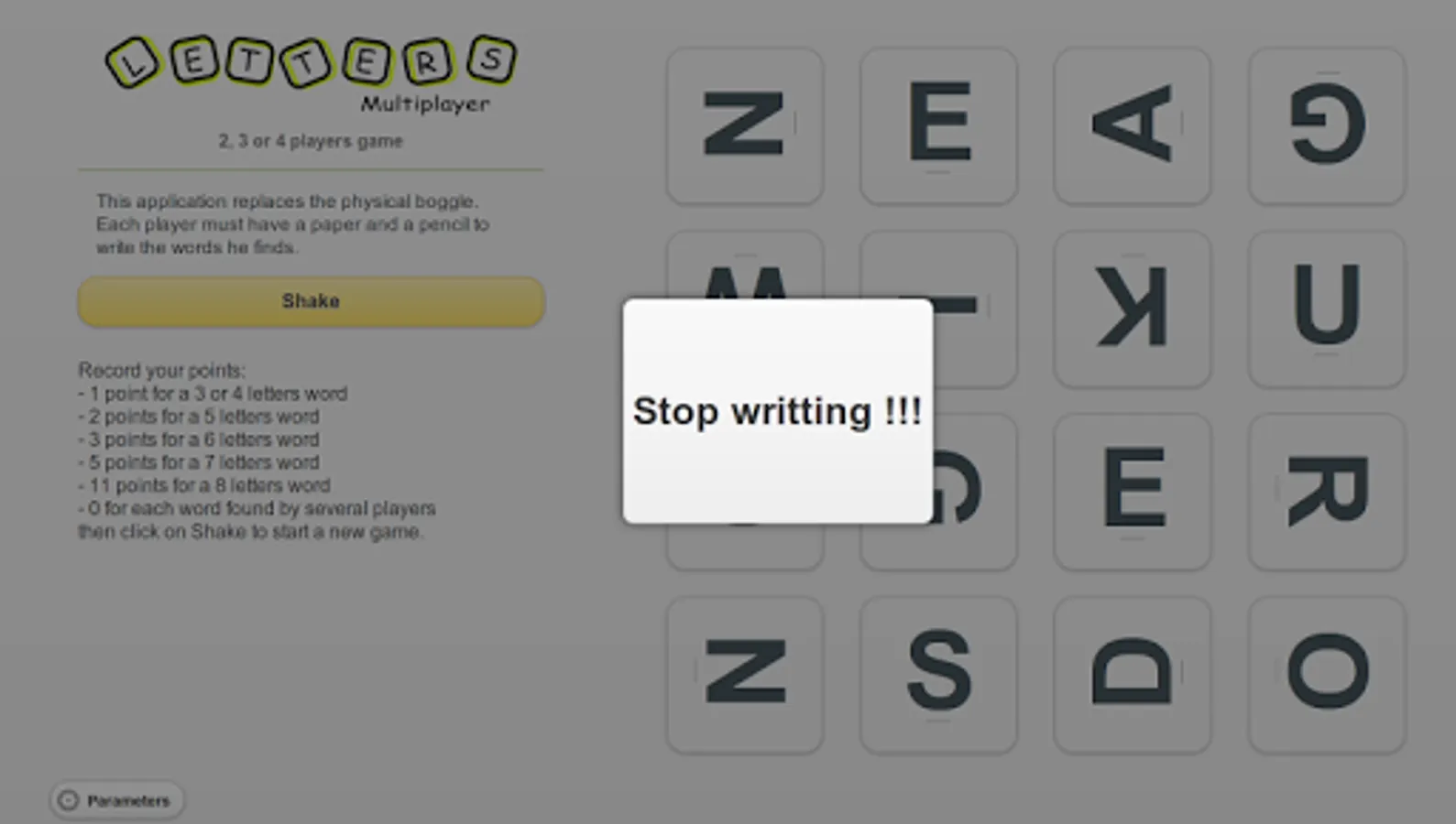 Each player should have a piece of paper and a pencil. Place your tablet on the table and click on "Shake" to start a new game.