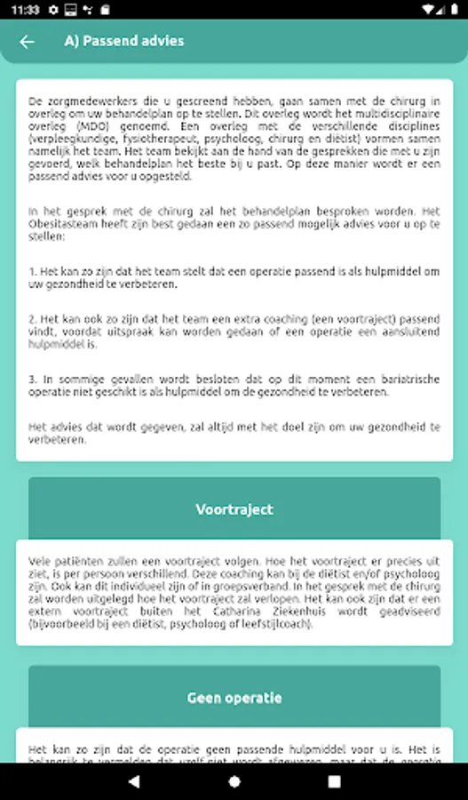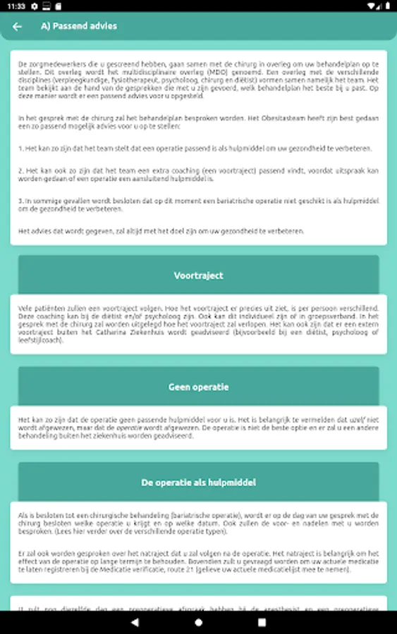 The Catharina Obesity Center app has been specially developed for the patients of the Obesity Center and supports them throughout the entire process. The app is the online coach where patients can go at any time for reliable information about obesity and the procedure.