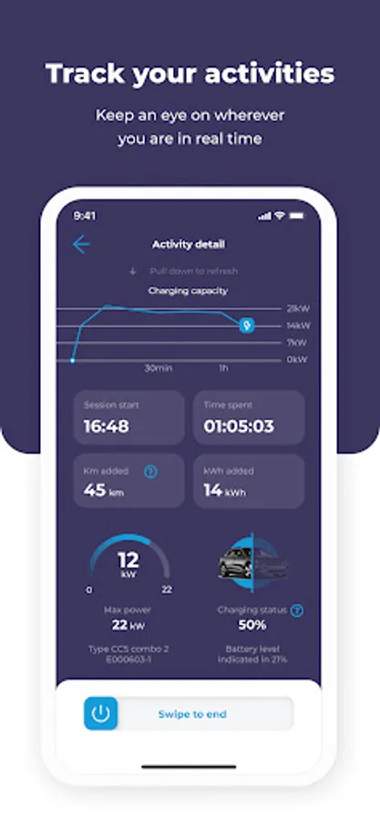 2. Monitor your electric recharges in real time: select the charging station and start recharging to get all the information you need and check the progress.