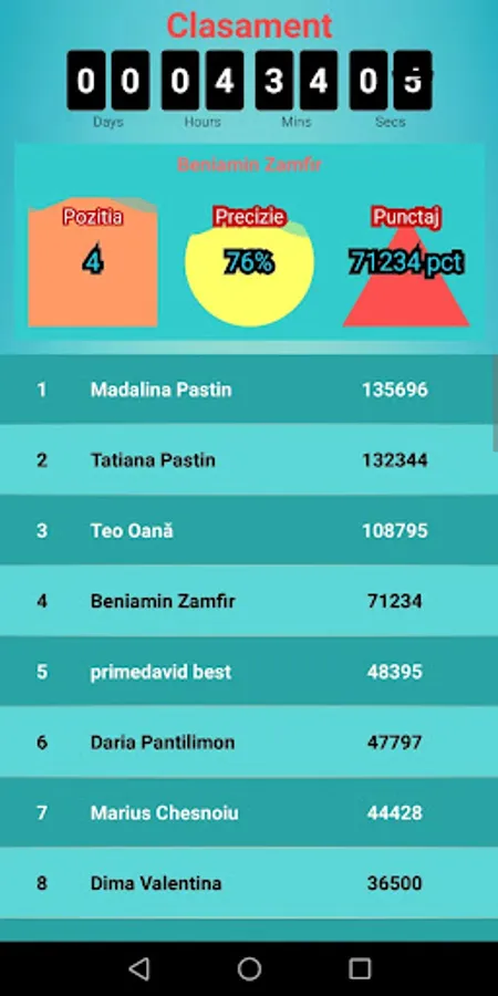 Punctajul obținut este cumulat și adaugat la clasament. În cadrul jocului există un clasament total și un clasament la nivelul fiecarei categorii. La sfârsitul fiecarei luni acest clasament se va reseta, iar punctajele obținute de către fiecare jucător în parte vor apărea în istoric.