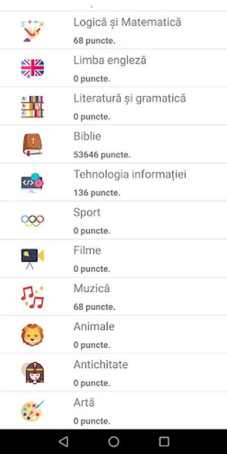 Jocul conține întrebări din mai multe categorii precum Cultură generală, Istorie, Limba engleză, Geografie, Biologie, Informatică, Biblie, Literatură și gramatică, Sport, Muzică și multe altele.