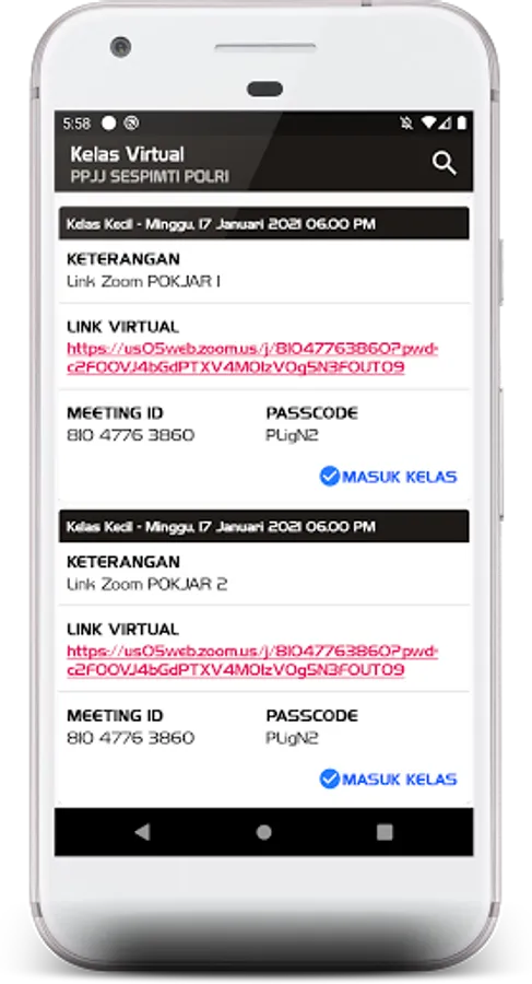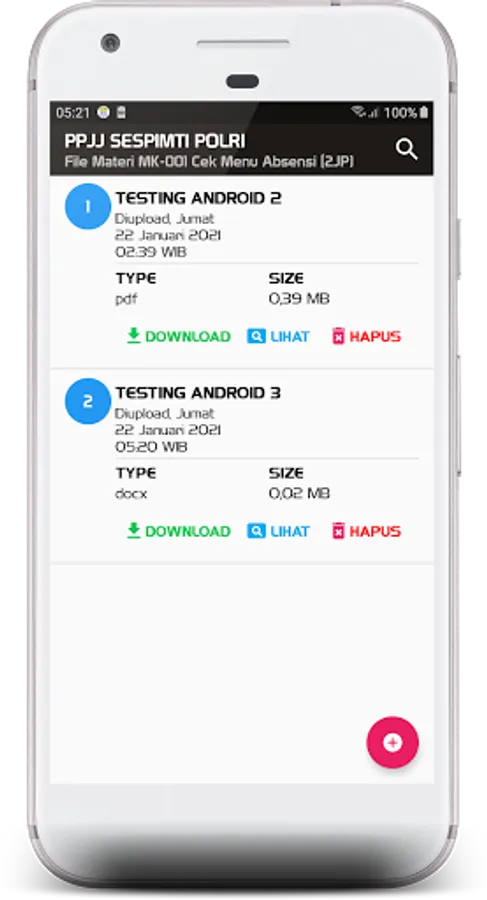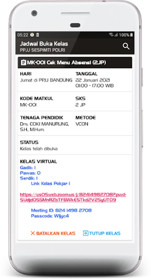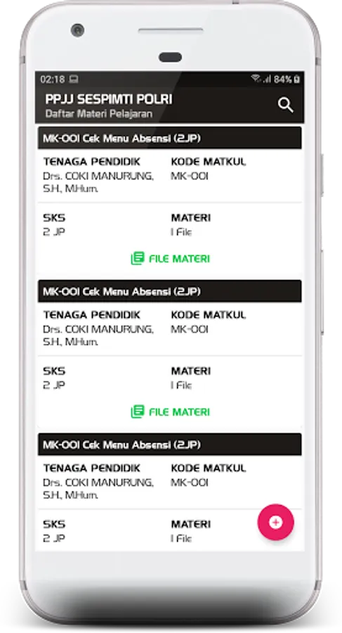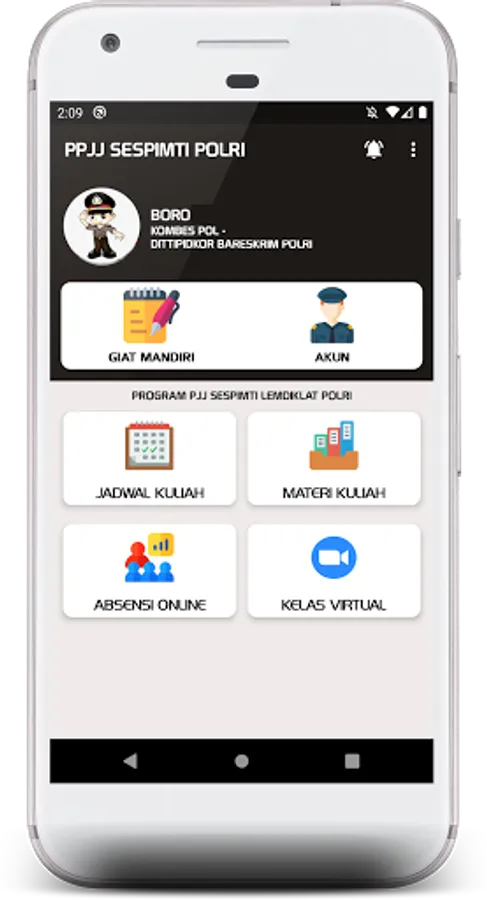 The PPJJ SESPIMTI POLRI application is an application that is used for the educational process of POLRI members using the online distance learning method. This application is designed to make the learning process easier, such as viewing schedule information, materials and being able to send active classes via a smartphone.