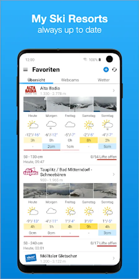 This app offers you detailed information for all skiing resorts in Austria, Switzerland, Italy, France, Germany, Slovenia, Poland, Czech, Slovakia and Croatia. Up-to-date snow reports, weather, webcams, ski maps, accommodations and much more.