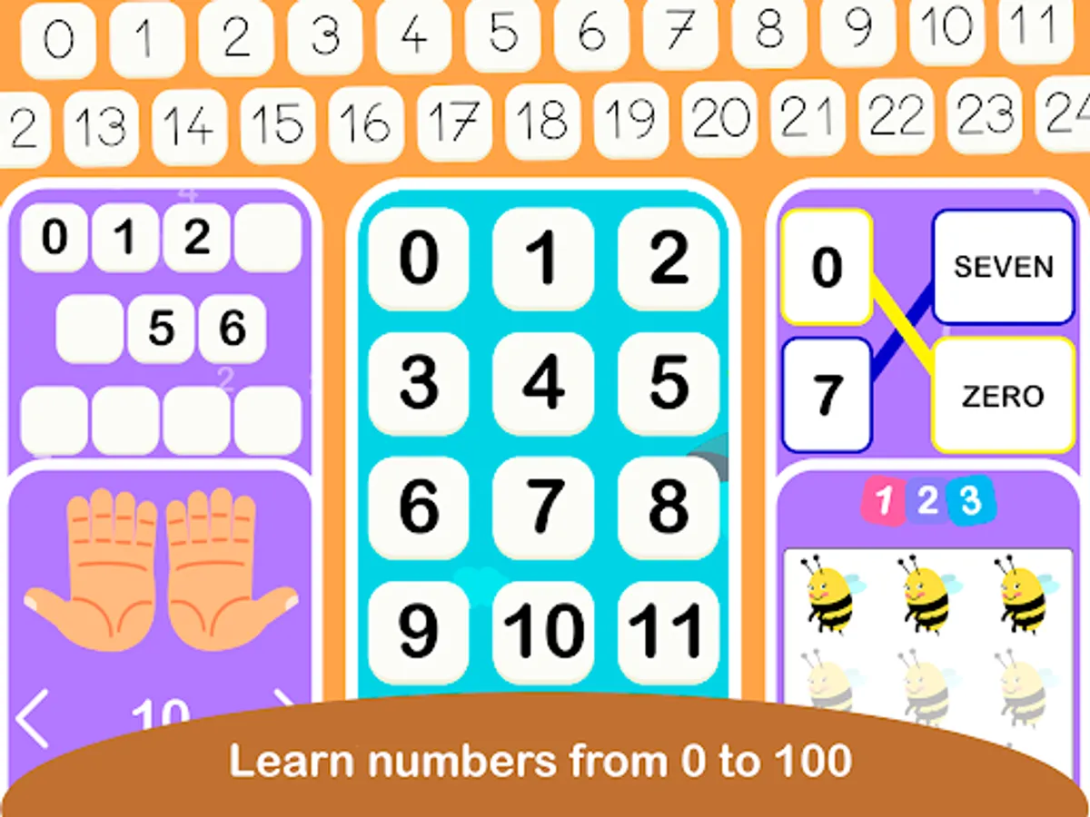 Children can also learn to speak and write the numbers from 0-100 and even count on fingers from 0-10.