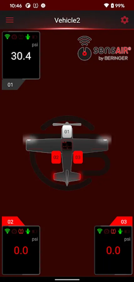 When tire sensors relay abnormal data, App will detect the abnormal status and use voice/audio to alert pilot and show the abnormal data and tire location on our TPMS APP.