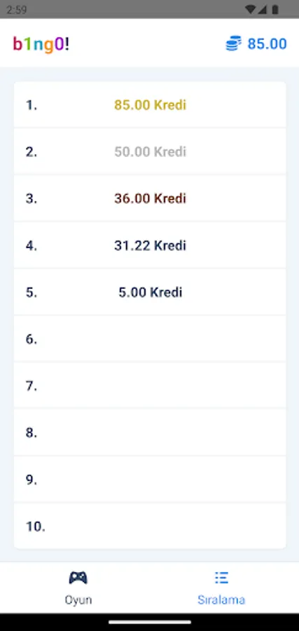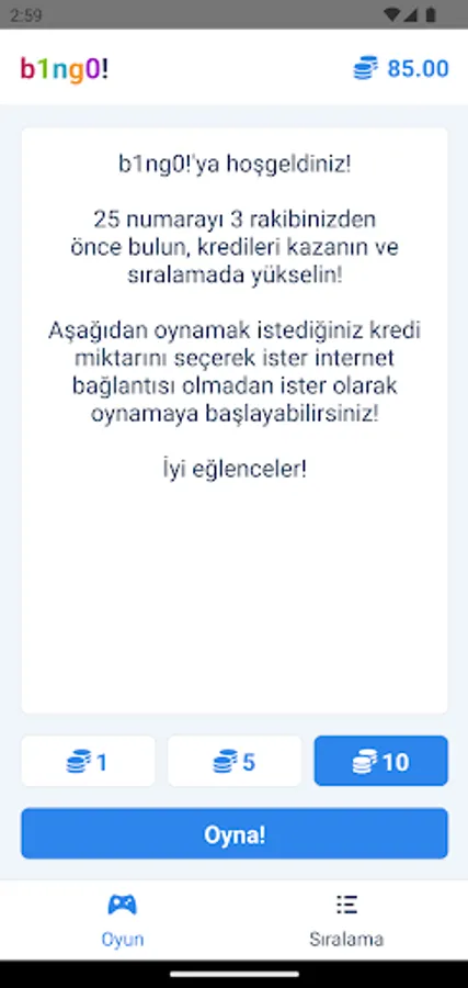 Welcome to b1ng0! Find 25 numbers before your 3 opponents, earn credits and rise in the rankings! By choosing the amount of credits you want to play, you can start playing as or without an internet connection! Have fun!